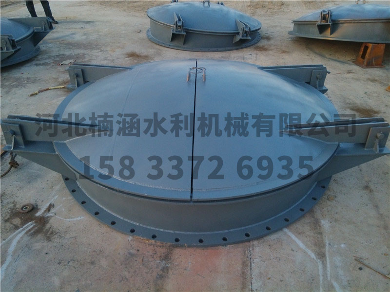 節(jié)能型側翻式拍門由門板、門鉸、門座和密封件等組成。門板通過門鉸安裝在門座上,根據(jù)國內(nèi)泵站的應用情況,拍門的門形圓形和矩形兩種。一般出水管口徑小于、等于2m的(即口徑1.6的泵)用圓形拍門,大于該口徑的用矩形拍門。